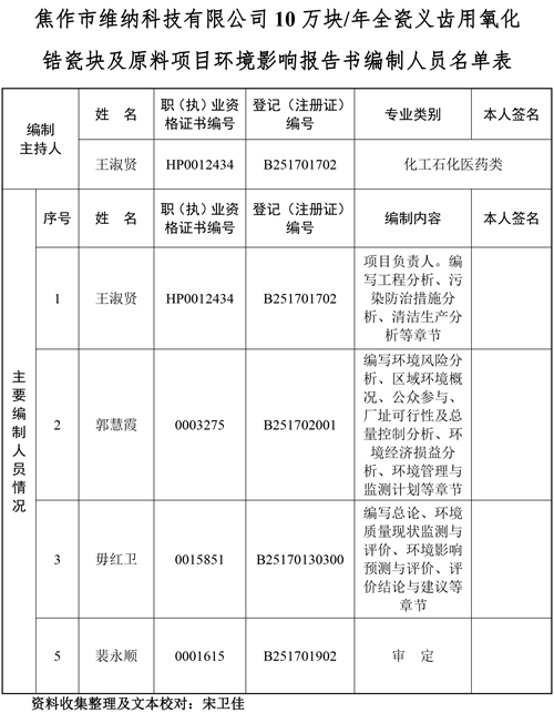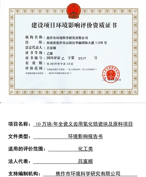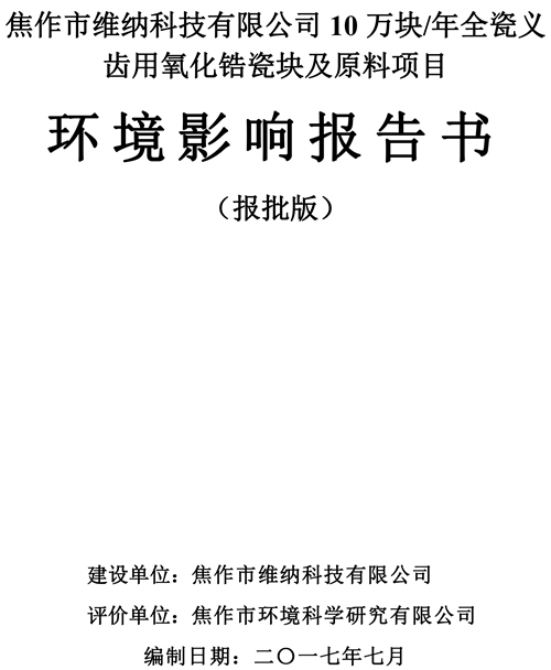 關(guān)于焦作市維納科技有限公司10萬塊/年全瓷義齒用氧化鋯瓷塊及原料項(xiàng)目環(huán)評報(bào)告書信息公司。